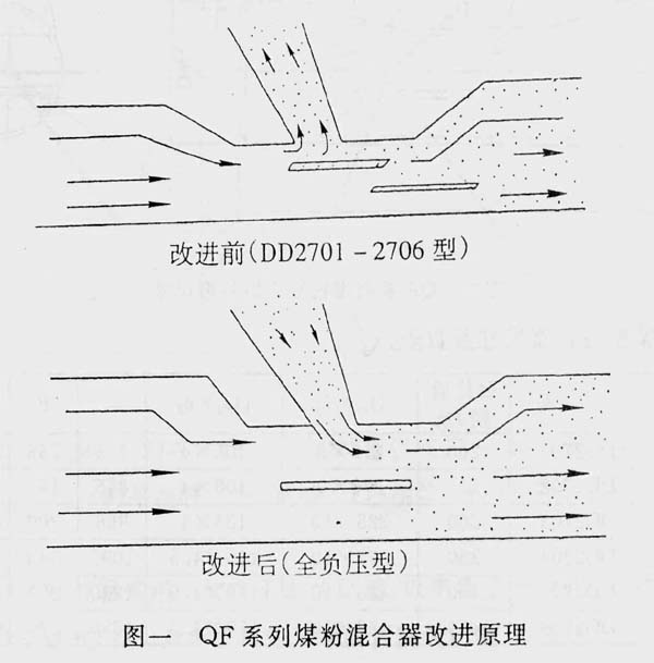 究其原因主要是:DD27系列煤粉混合器結(jié)構(gòu)設(shè)計尚欠合理,該混合器的雙托板結(jié)構(gòu)阻力大,造成落粉管內(nèi)部呈現(xiàn)正壓,使煤耗粉從給粉機下落時被下部正壓托住,形成托粉現(xiàn)象,影響給煤均勻性。WL—QF系列全負壓煤粉混合器把雙層托板改成單托板(參見圖一),又在落粉管與混合器聯(lián)接處的后壁加一塊弧形鋼板插入煤粉混合器內(nèi)部一定深度,使流經(jīng)的一次風(fēng)對落粉管產(chǎn)生引流作用,徹底消除了托粉現(xiàn)象。同時減輕給粉機下部垂直管段到與一次風(fēng)管連接處的磨損,大大延長使用壽命。